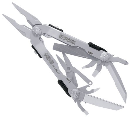 Gerber Diesel Multi Plier - Needle Nose Pliers, Wire Cutter, Partially Serrated Knife Blade, Cross Point Screwdriver, Small, Medium And Large Flat Blade Screwdrivers, Can Opener, Bottle Opener, File, Saw, And Scissors. Handle Material: Stainless Steel. Handle Color: Bead Blast. Sheath Material: Ballistic Nylon. Safety Plus Locking System, 4 Screwdrivers. Overall length: 6.61"(inches). Length Closed: 4.92"(inches). Printed on Tool: GERBER DIESEL MULTIPLIER in Black Lettering. Ideal for Construction Jobs, Fishing, Hunting, Camping, Emergencies, Etc.